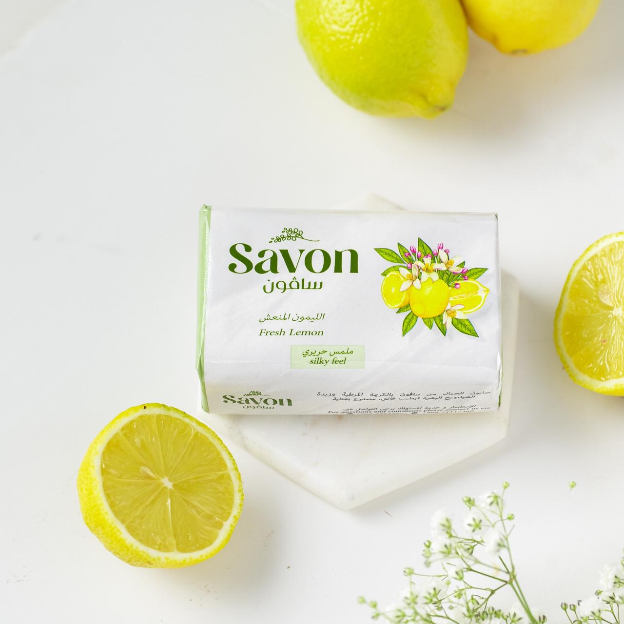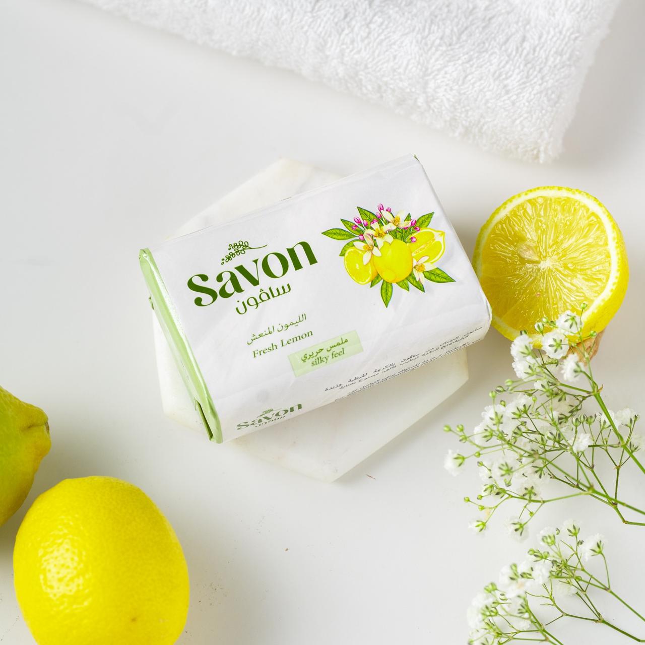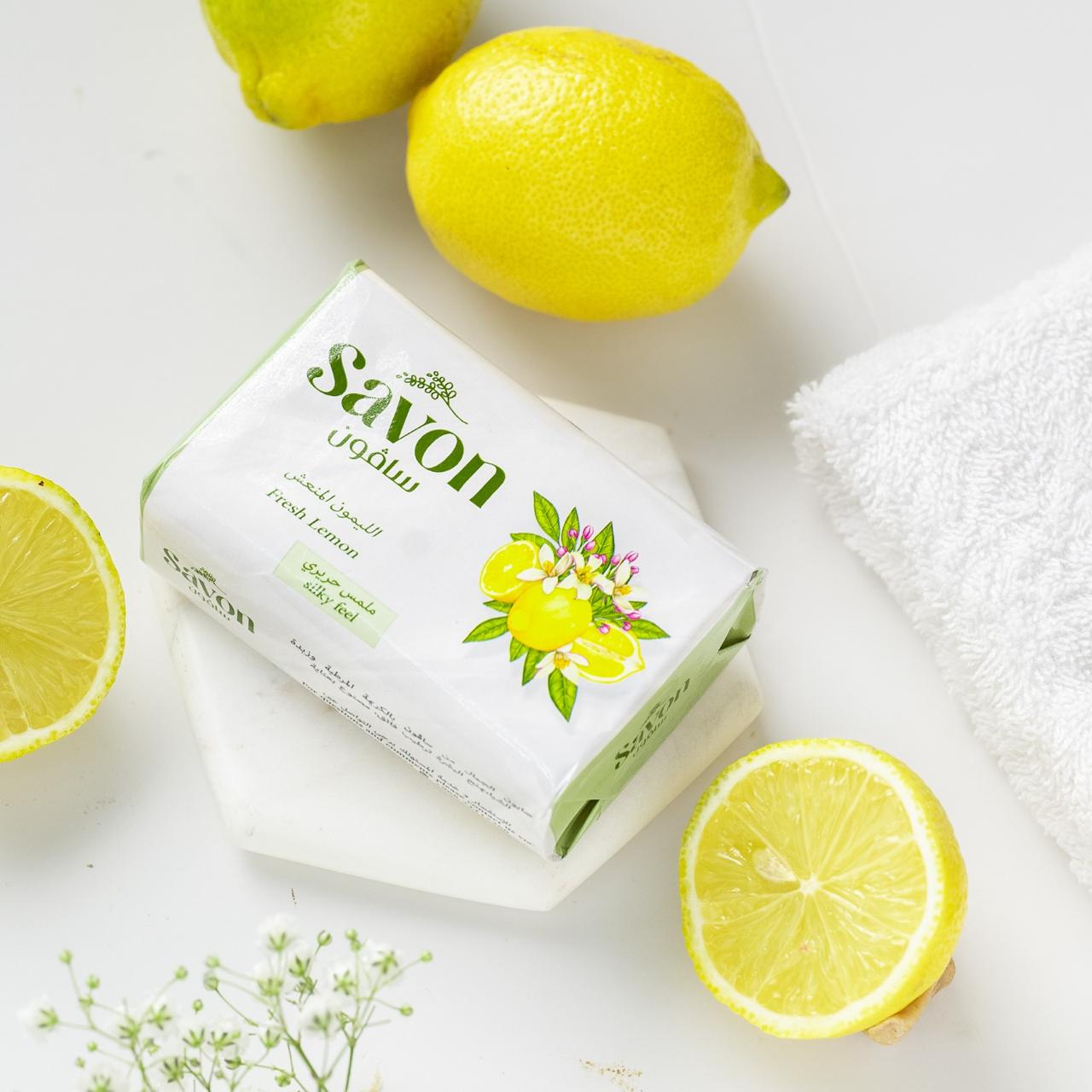 استيقظي على إشراقة مفعمة بالحيوية مع صابون ساڤون برائحة الليمون المنعش، تماماً كما يبعث كوب من عصير الليمون البارد النشاط في النفس.